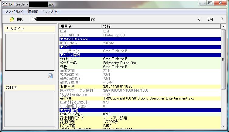 一部で話題にされているが、GT5の画像をExifリーダー等で開くとPhotoshop 3.0という文字列が見える問題